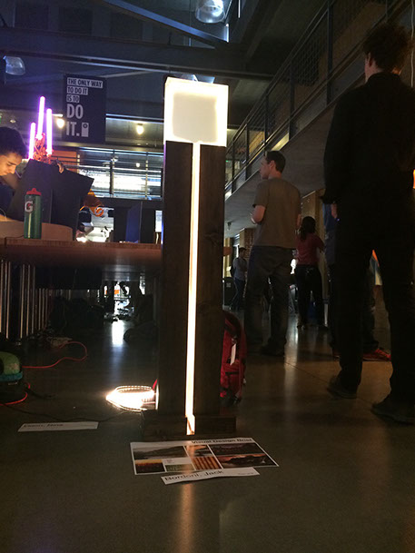 Construction of the lamp took place in approximately 5 days. The wooden structure was cut to size out of sheets of pine, and then combined using wood glue. Each wooden part was carefully sanded in preparation for staining and coating. Acrylic parts were combined using acrylic cement. Finally, all pieces were assembled together and lights were added.