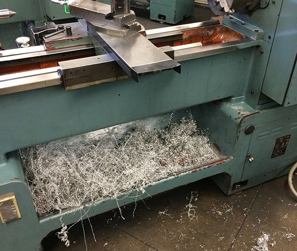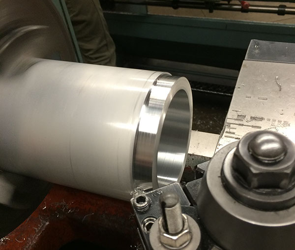 Using the lathe to create the part of the base that would direct candy out of the slot