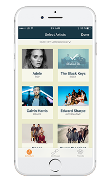 The first view a user sees is the “Scheduling” view. This view allows users to select their favorite artists that they want to track and see how many other friends that are also planning on attending that performance. Users could add artists easily, finding the artist by alphabetical name, genre, or band photo. To select an artist to follow, they would simply tap on the artist’s card. Once a user selects their favorite artists, they would press “Done” and be shown a timeline for the performances of the artists they have selected. In this example, I differentiated between different stages by changing the color of the time box. Users would also be able to see the number of friends that are planning on attending that performance in the bottom right of each calendar entry. If a user has a gap in their schedule, the app would suggest a performance based off similar artists or the number of friends that are attending that performance. Users could also switch easily into a view that showed all artists playing at that time.