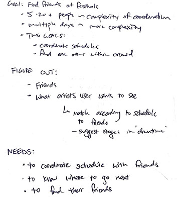 For this experiment, I imagined a group that could be anywhere from about 5-20 people. Because festivals have multiple stages with different performing artists going on at the same time, a common issue that I’ve experienced is not just figuring out when your own personal artists are playing, but what I should do when I have no favorite artists currently playing. If two artists that I enjoy were playing at the same time, I would likely prefer to go to the one that my most friends were going to. From this, I declared three main needs that these users have and would be trying to solve using the app.