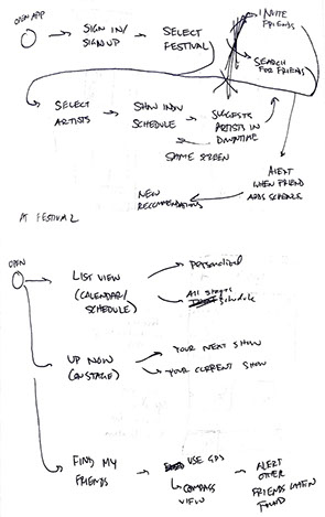 Thus, I started writing out simple flows made out of text and arrows. When thinking about the app, it made sense to consider it as not just something that was useful when you were at a festival, but something that would also serve a purpose before the festival when trying to plan out your day to eventually see all your favorite artists. It seemed like this was also a natural opportunity to allow the user to find new festivals or purchase tickets so there was incentive to download and keep the app, rather than have it serve no other purpose after a single use at a single festival. As a result, I started mocking up a flow that took place before the festival started, and then another flow once you had arrived at the festival.