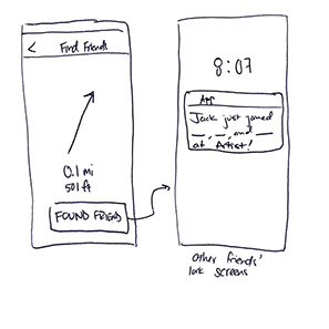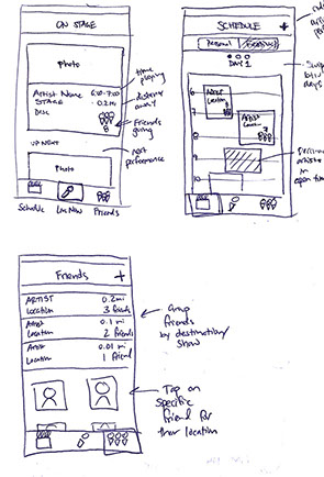 Once the flow was established, I then began to mock up individual screens showing the main functionality of the app. I ultimately decided that the app would have three main views when in use during a festival - On Stage, Schedule, and Friends. I also quickly mocked up what it might look like to try to find friends at the festival, both from the perspective of someone actively trying to find their friends in a crowd, and the perspective of the friends that the person was trying to find so that they could be alerted that their other friend was trying to join them. I’ll go more into detail about these screens later.