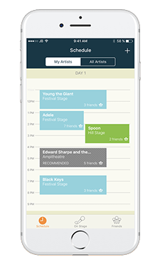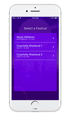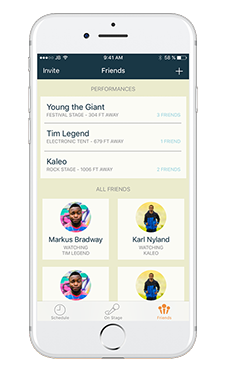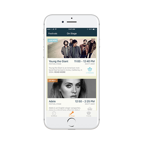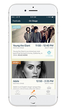 Meanwhile, the “On Stage” view was designed to give the user a better idea of what’s going on now. It shows the currently playing artists, which stage they are playing at, how far away it is, a brief description, and a count of how many friends are currently at that stage. The goal of this screen was to give a better experience once the user was actually at the festival and didn’t want to be overwhelmed with the performances going on later at the festival.