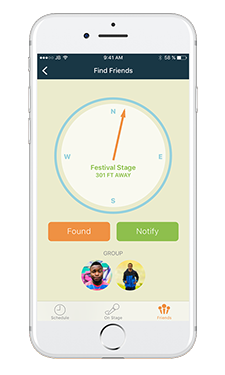 Lastly, I created a “Friends” area of the app, which was dedicated to the people that were attending the festival with you in your friend group. It is here where you could see where all your friends were located now and who was performing at each of those locations. For instance, if you really like music similar to a friend, you’d be able to quickly find him by looking at the Friends area to figure out what stage he is currently at. If you scrolled down, you’d see a card for each friend in your group. Once you arrived at the stage that your friend is at, you would scroll to these cards and select the friend you wanted to meet. It would then visibly show you which direction you should go and how far away that friend was, based off the GPS and compass sensors available in nearly all phones today. If you tapped “Notify”, your friend would be notified that you were trying to find him through push notifications. This was designed with the hope of trying to find your friend as easily as possible, given it can often be difficult when you’re trying to find a friend in the midst of a sea of thousands of other fans.
