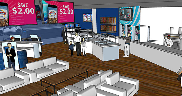 It became apparent that the sale of packaged and bottled items weren’t nearly as unique to RaceTrac as those other experiences, so we decided to condense that area as much as possible. To do this, we decided to push all packaged and bottled items to a condensed inventory space at the back of the store that was out of sight of the customers. If customers wanted something packaged or bottled, they would place an order through their phone or through an in-store kiosk, and the items would be delivered to a series of lockers similar to Amazon Lockers.