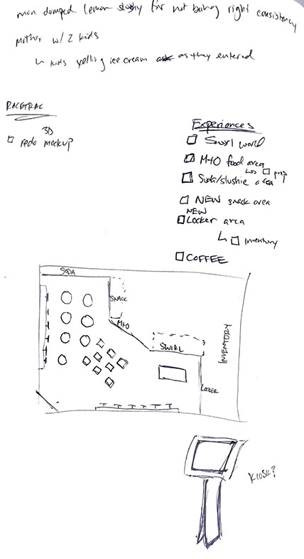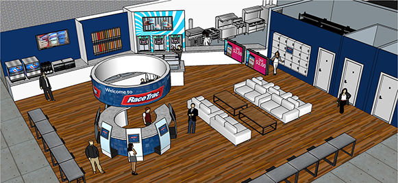Given this goal, we realized we were likely dealing with significantly less space than was typically in a RaceTrac store, and, as a result, would need an entirely different floor plan. We began thinking of what was critical to the RaceTrac experience, and what were areas that weren’t specific to RaceTrac that we didn’t necessarily need to focus on as much. It became clear to us that what made RaceTrac unique was its family-friendliness and its personalized experiences through offerings like Swirl World, Made-to-Order areas, and their coffee areas.