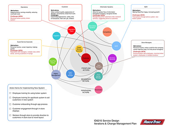 Given our understanding of how the company operated from talking with the NCR and RaceTrac representatives, our observations in the stores themselves, our interviews with those working inside a RaceTrac store, and our own research, we were able to create a stakeholder map. This stakeholder map would allow us to see how each of our changes might impact relationships between people that work at RaceTrac and the customer, and was crucial for eventually constructing a change management plan.