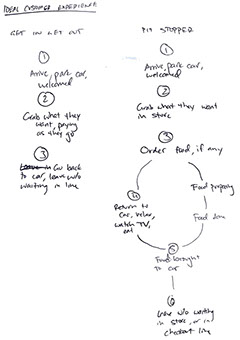 At this point, we had not yet decided to think about an urban-specific store. When trying to come up with solutions to fit these customers, I sketched out a few ideal flows and tried to remember what their goals and ambitions were, often taking note of what I thought they might benefit from given their pains in the current system: