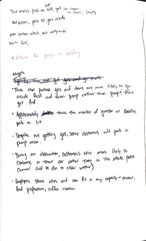 To understand how customers acted in the stores themselves, we completed numerous observation sessions where we would sit in a corner of the store, outside on the dining tables, or in our vehicles and watch customers interact with different areas of the store, both inside and out. In total, we completed seven observations across five different stores in the Atlanta area, each watching customers for about 2 hours. The goal of these observations was to understand customer and employee patterns in their behavior to see if there were any painpoints or parts of the RaceTrac experience that could be improved.