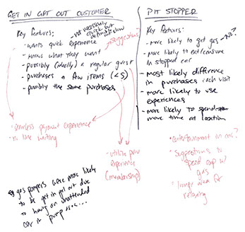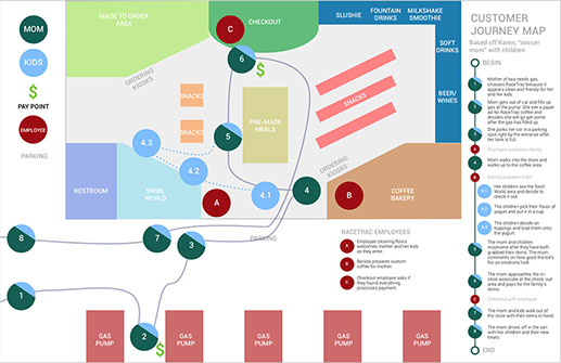 As a result of these observations and interviews, we were able to start creating customer journey maps, stakeholder relationship maps, and major customer personas that we would be our main artifacts for reference when designing the future RaceTrac store.