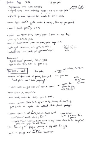 Here are two pages of the notes that I personally took during these sessions. One page is raw notes (left) while the other (right) summarized that day's observations. These, along with tens of other pages of notes, were quickly scribbled and then transcribed after the observation session was complete for easier reference and later use.