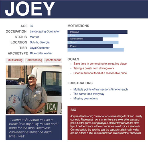 Joey was representative of our blue-collar workers that often visit RaceTrac for breaks between work. He’s often on the move, and as a result, utilizes his time at RaceTrac to stop and rest. He doesn’t necessarily get gas every time he is at RaceTrac, but may often just come for lunch or to get a large fountain drink.