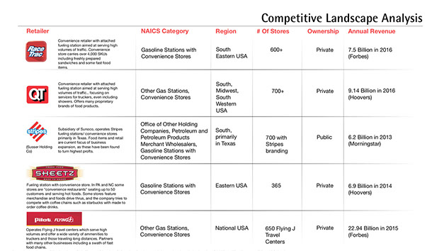 We also looked into RaceTrac’s competitors, which consisted of companies like QT, Stripes, Sheetz, Pilot, 7-Eleven, and Wawa. A summary of the largest regional competitors is shown here.