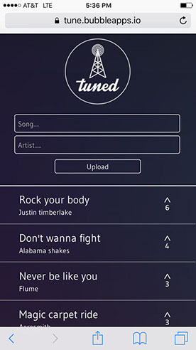 Thus, our Bubble apps prototype was worked on further to address some of these issues. Now, people could only vote once on each song to prevent spamming. UI improvements were made to make it look more clean, friendly, and to encourage upvoting. We were quickly able to integrate with an iTunes API so that people could only suggest songs that actually exist. If a song was suggested twice, it wouldn’t add the song so that the queue was kept at a minimum. Lastly, we added an “Admin” side of the app so that we could easily remove the most popular song after it had been played so that it was always clear what was on the top of the queue.