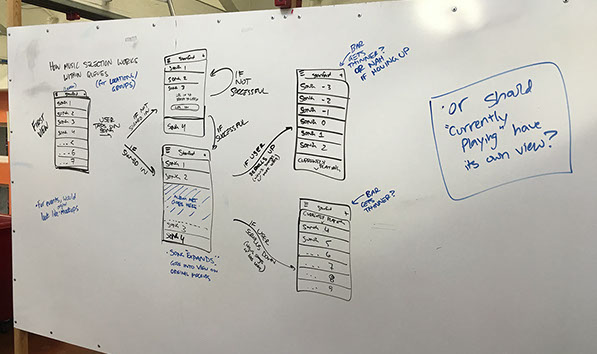 Feedback for these initial mockups was that the album artwork was given way too much real estate on the screen, so it was difficult to see all the songs that were currently in the queue. Only being able to “Like” songs was appreciated, but it was clear that the “Like” option was too similar to Facebook’s “Like” option and that the UI as a whole was a little too complicated and cluttered. Overall, I was happy with this feedback and it was a perfect learning experience to figure out how to design for mobile.