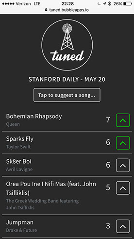 This time, users were sent the link beforehand to vote on songs before the party even started. This allowed for a fairly long queue to develop before the first song had been played. Still, participation at the early stages of the event was not as high as we would have liked. However, once people knew that our system existed and heard a few songs, they got more involved. The social dynamics we observed in our first tests also began to appear in our most recent prototype - users continued to rally support for songs from each other that they wanted to hear. Yet one of the most intriguing observations came from a guest: “Please upvote the Avril Lavigne song I just suggested, my friend will go nuts if she hears it.” When we originally came up with the idea of Tuned, it had never occurred to us that people would suggest songs for not just themselves, but for their friends as well. This exciting development reaffirmed our desire to be an aid to a party, rather than a crutch that sucked people into their phones unnecessarily.