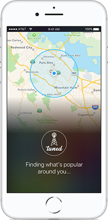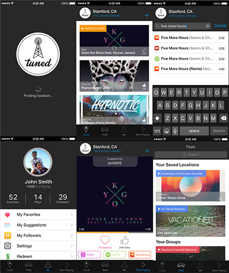 The first iteration of the Tuned app consisted of a series of location based queues. Essentially, these were almost like radio stations. Our initial target audience was college campuses, and our thought was that each college campus would have its own style of music that it enjoyed. People would only be able to suggest and vote on songs in their own “zone” as determined by a radius around wherever they were currently located. Users would also be able to view other areas and tune into what they were listening to.