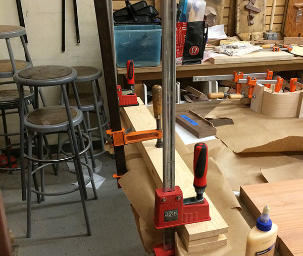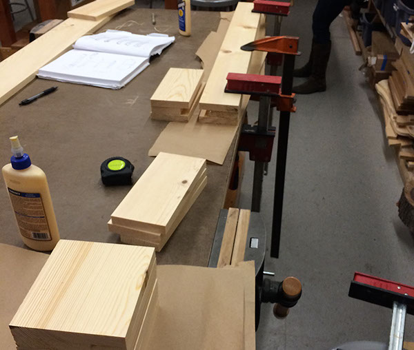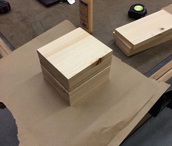 Construction of the lamp took place in approximately 5 days. The wooden structure was cut to size out of sheets of pine, and then combined using wood glue. Each wooden part was carefully sanded in preparation for staining and coating. Acrylic parts were combined using acrylic cement. Finally, all pieces were assembled together and lights were added.